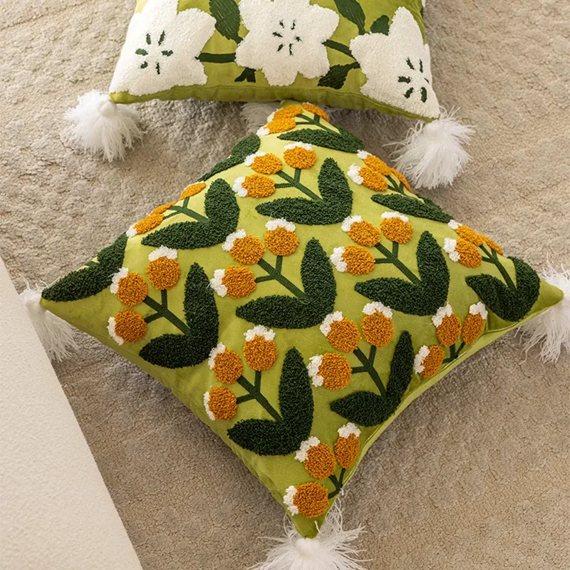 アメリカンレトロデザインのクッション|リビングソファにぴったりなラグジュアリー感!美しい異形餃子花デザインとおしゃれなフリル縁|洗濯可能でお手入れ簡単!あなたの空間を華やかに彩ります。