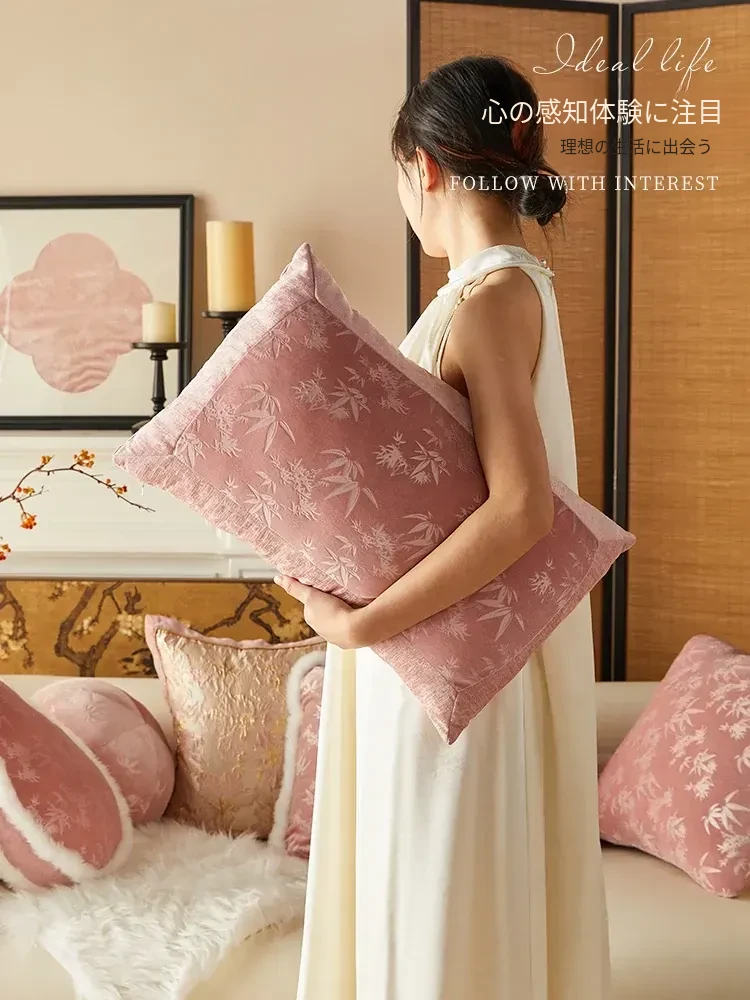 新中式高級感あふれるソファ用抱き枕 - 客間にぴったりな軽やかなデザイン!寝室のベッドヘッドにも最適なピンクの中国風クッション。心地よい腰サポートで、優雅な空間を演出します。