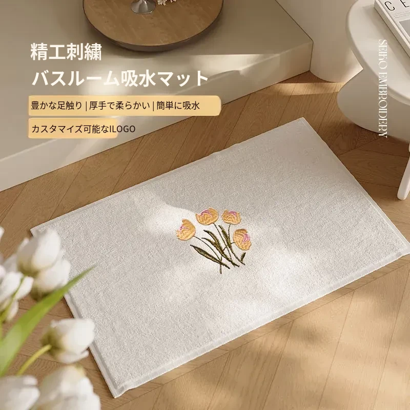 五つ星ホテル品質!チューリップ刺繍入り吸水マット - バスルーム用速乾・汚れに強いデザインラグ!快適なシャワータイムを演出します。