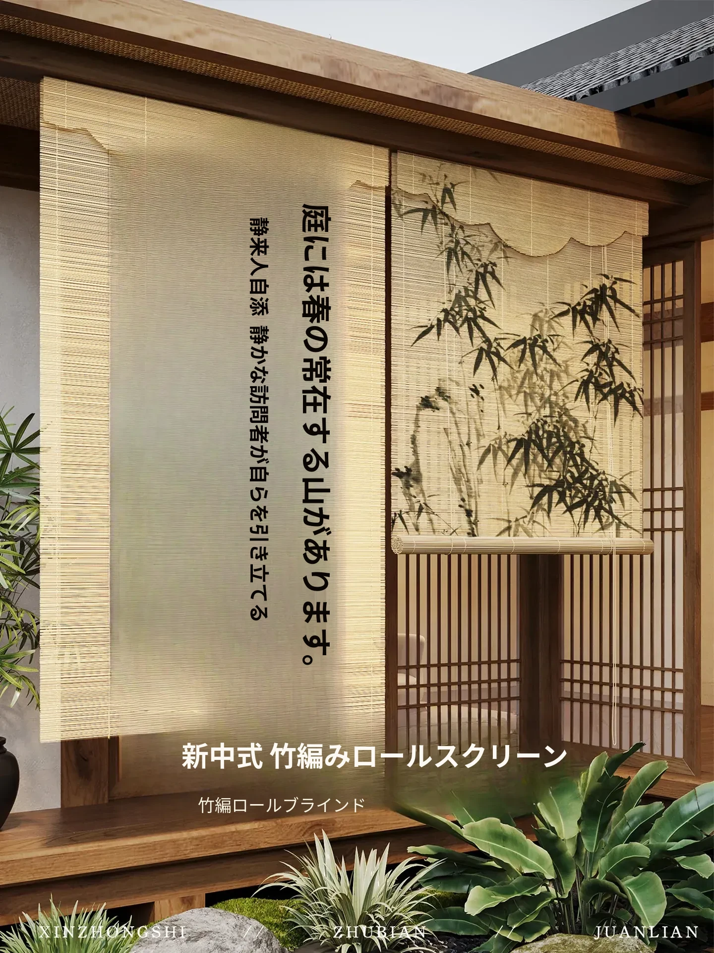 宋氏美学竹製ロールカーテン - 新中式・古風デザインの茶室にぴったり!遮光・仕切り効果があり、壁面装飾にも最適な竹編みカーテン。心を癒す和の空間を演出します。