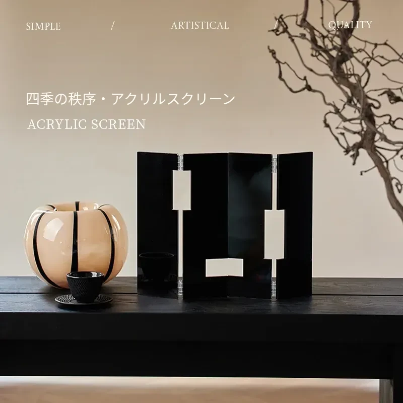 新中式アクリルデスクパーテーション、洗練された黒色オフィス装飾品。禅の雰囲気を醸し出す茶室デスク用アクセサリーで、心を落ち着ける空間を演出します。