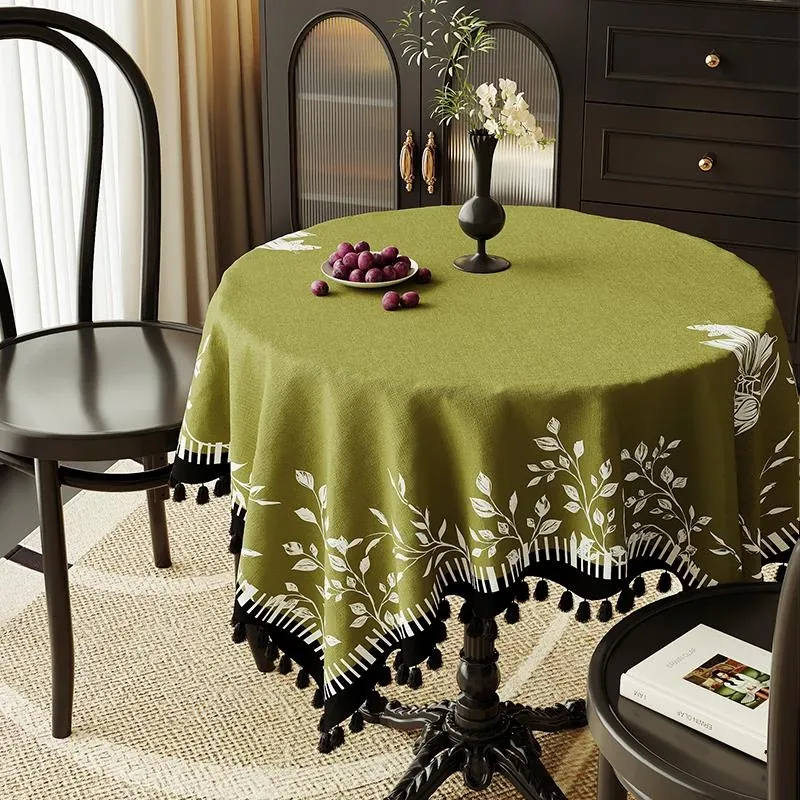防水・防熱の高級感漂うヴィンテージ風ラウンドテーブルクロス。エレガントなグリーンで、ティーテーブルを華やかに演出。フリンジ付きで、軽やかな雰囲気をプラス!