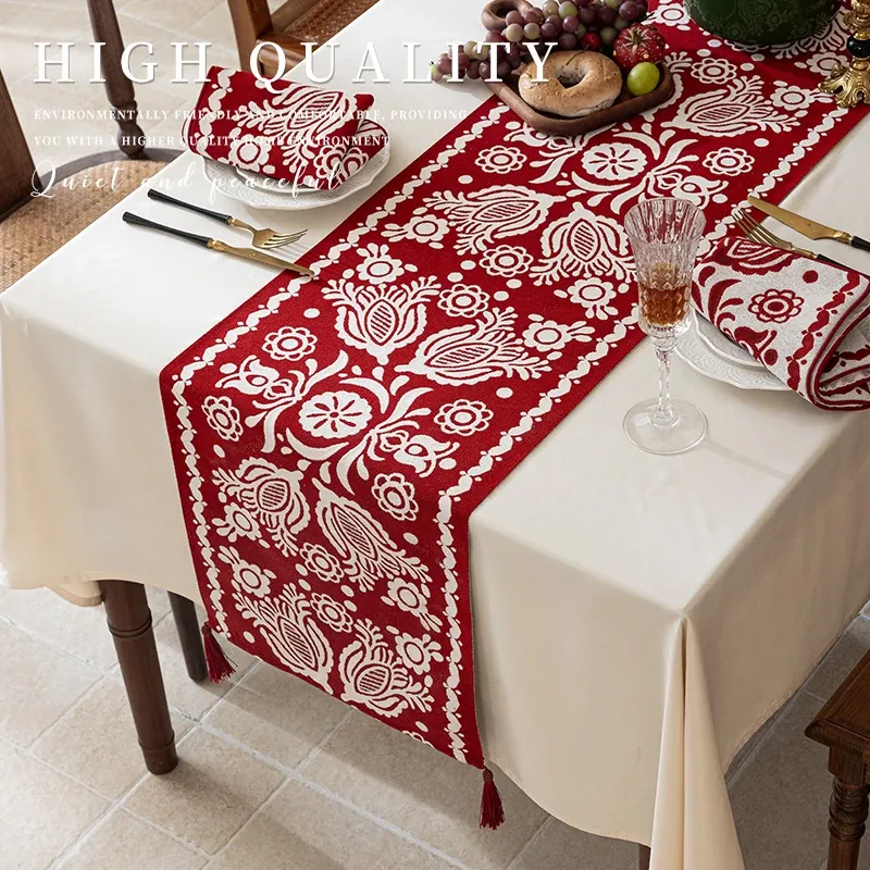 高級感溢れる赤いカルダモンテーブルクロス - お祝いの雰囲気を演出する欧風デザイン。新中式スタイルの結婚式や特別なイベントに最適な贅沢なテーブル布で、あなたのダイニングを華やかに彩ります。