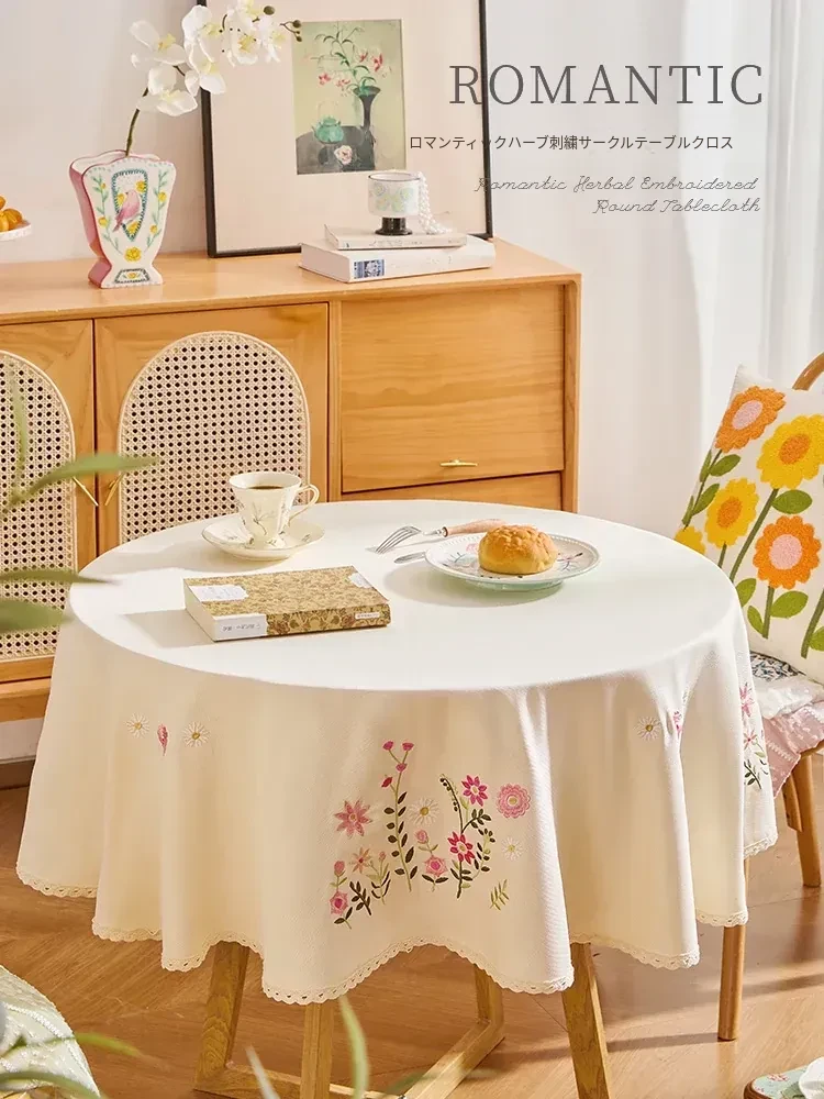 新中式刺繍デザインのラウンドテーブルクロス - 高級感あふれる立体的なフラワーパターン、和風の茶卓にぴったり!おしゃれで優雅な食卓演出に最適なアイテムです。