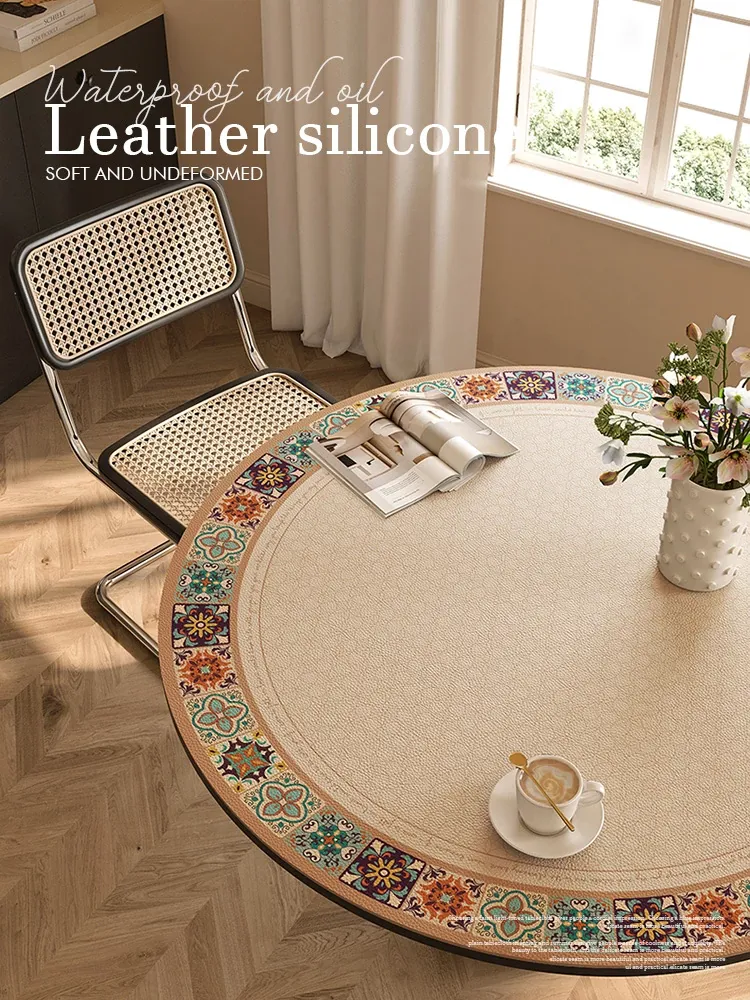 アメリカンスタイルの防水テーブルマット - 油汚れを防ぎ、熱から守るレトロな円形テーブルクロス。レザー素材でお手入れ簡単、ティーテーブルやダイニングテーブルに最適!
