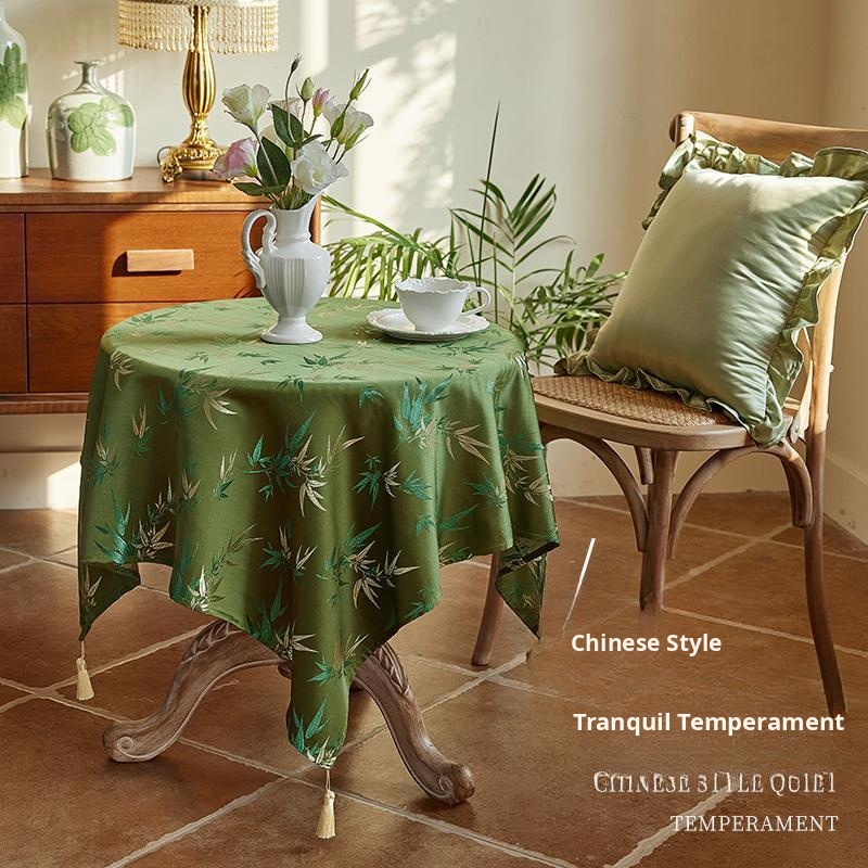 Elegant Green Bamboo Round Tablecloth with Tassels - New Chinese Style Lace Design for Dining Table and Coffee Table, Perfect for a Luxurious Touch