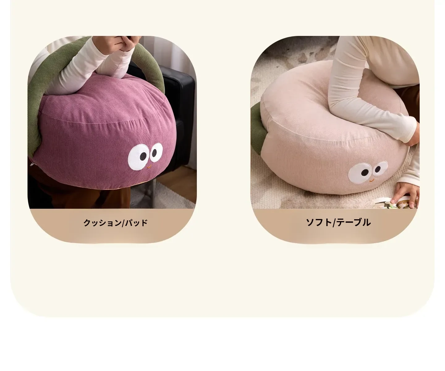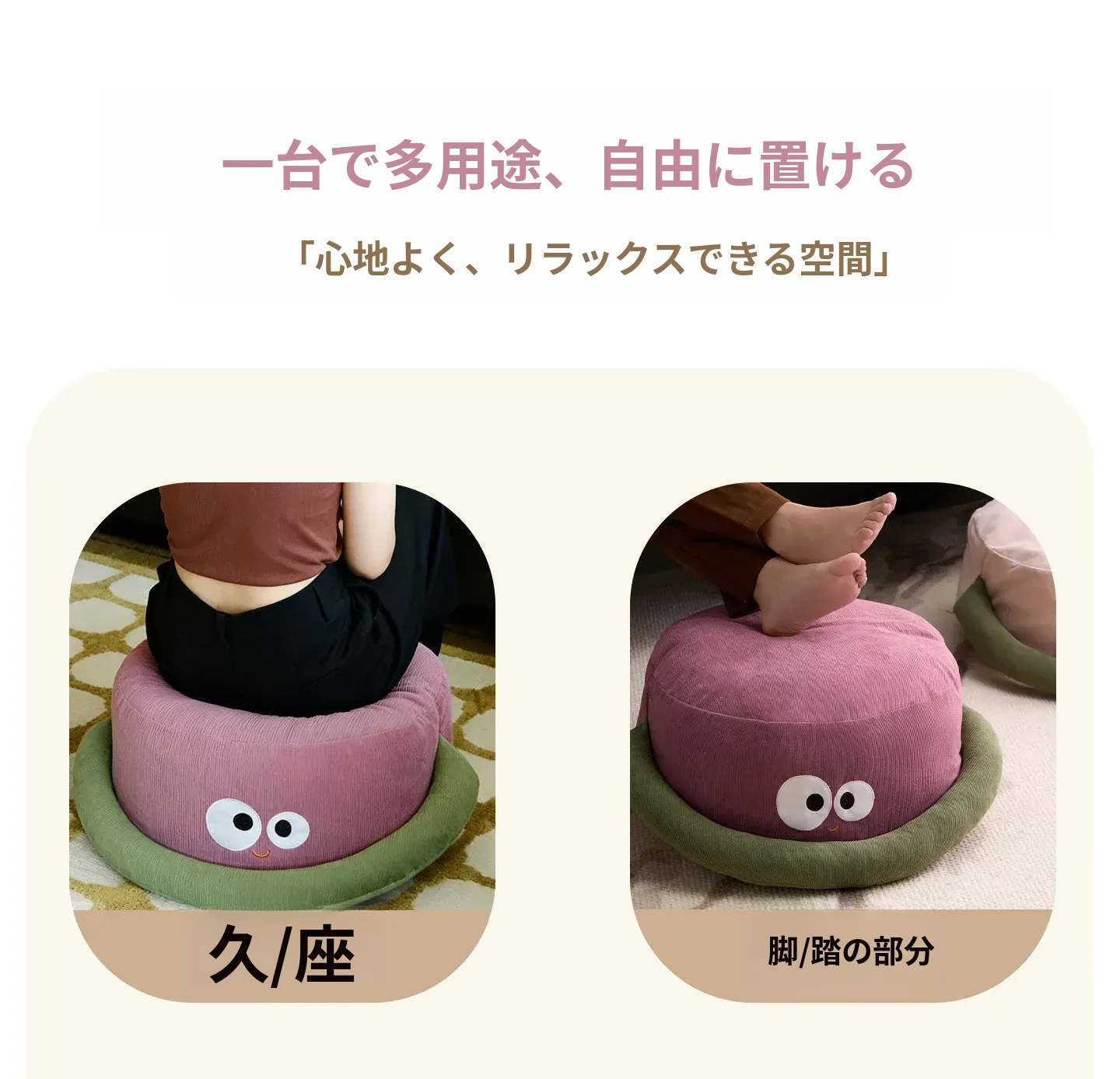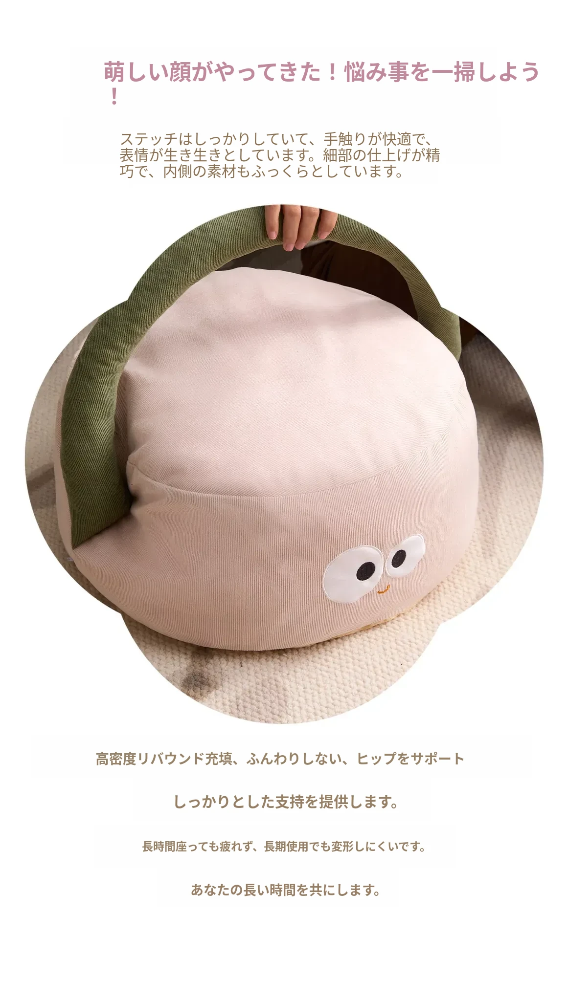 可愛いキャラクターの地上用座椅子!女性にぴったりのラフなデザインで、リビングや寝室に最適。快適なクッション性で、くつろぎのひとときをお届けします。畳やカーペットにも合うおしゃれなフロアクッションです!