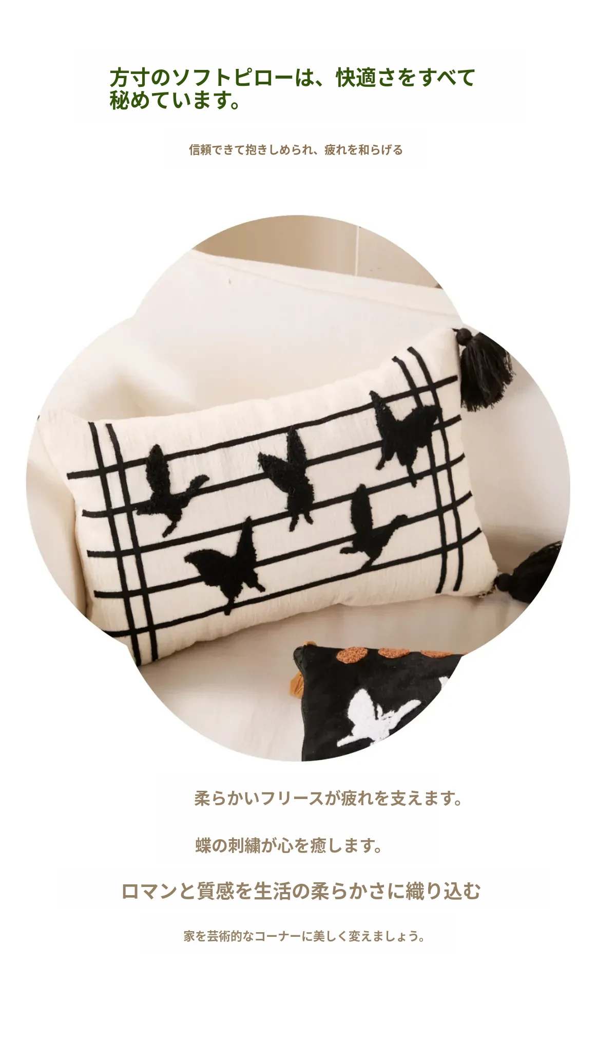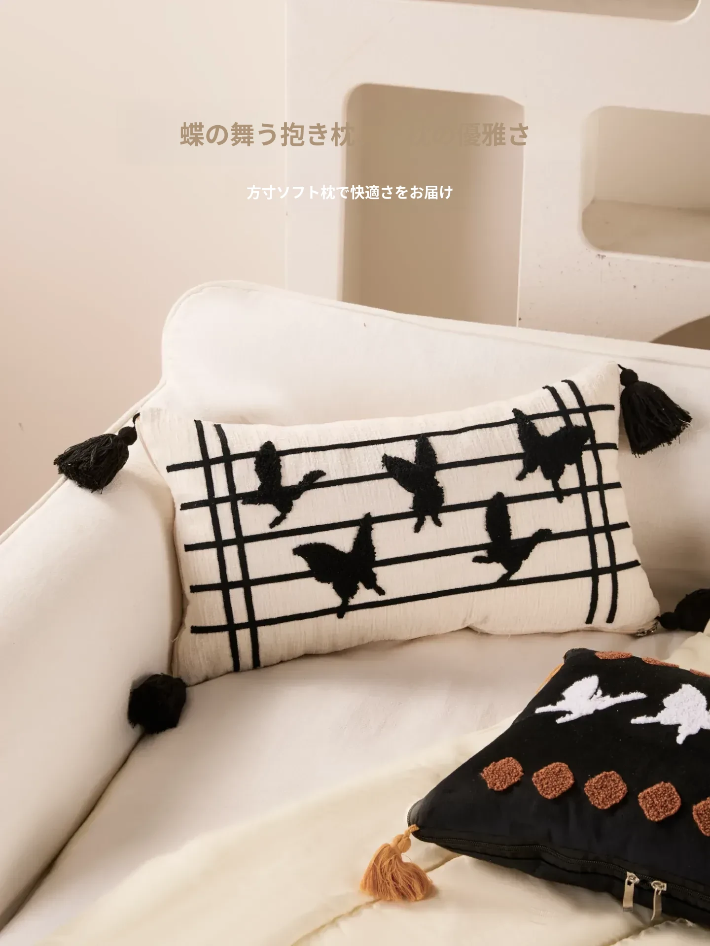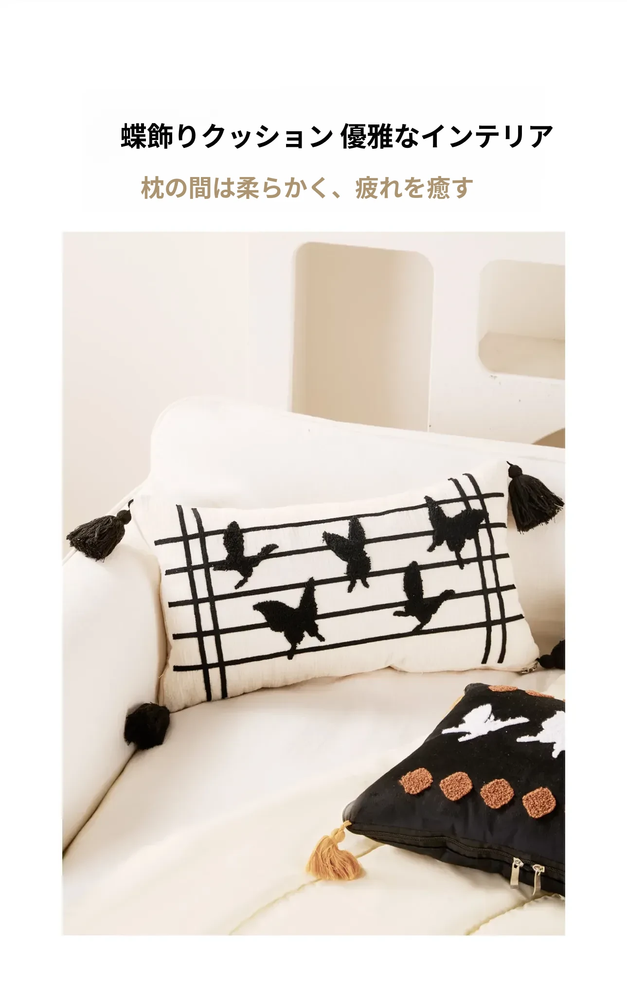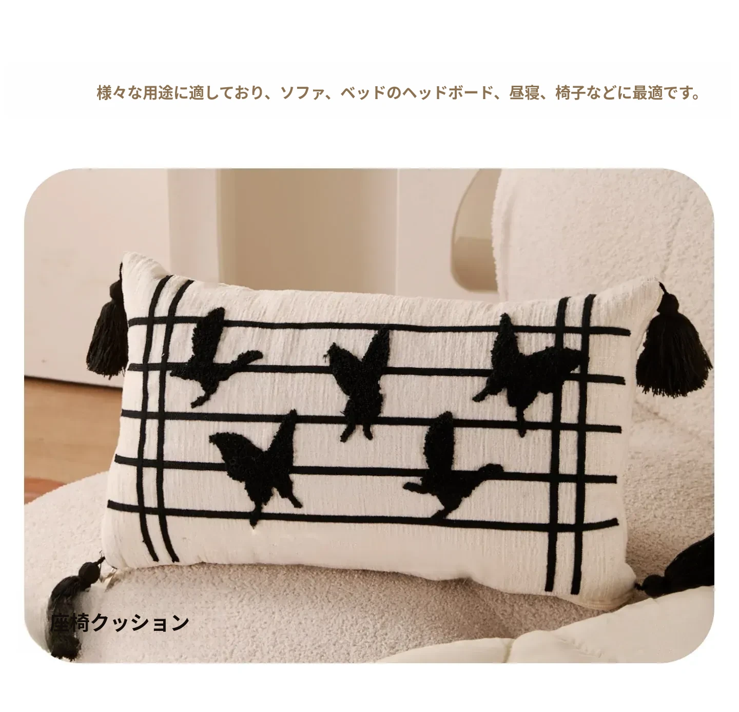 新中式デザインの流れるようなフリンジ付きバタフライクッション - 高級感溢れる黒色で、リビングやソファにぴったり!腰をサポートし、ベッドでの脚の間に置いても快適。優雅さと機能性を兼ね備えたアイテムです。