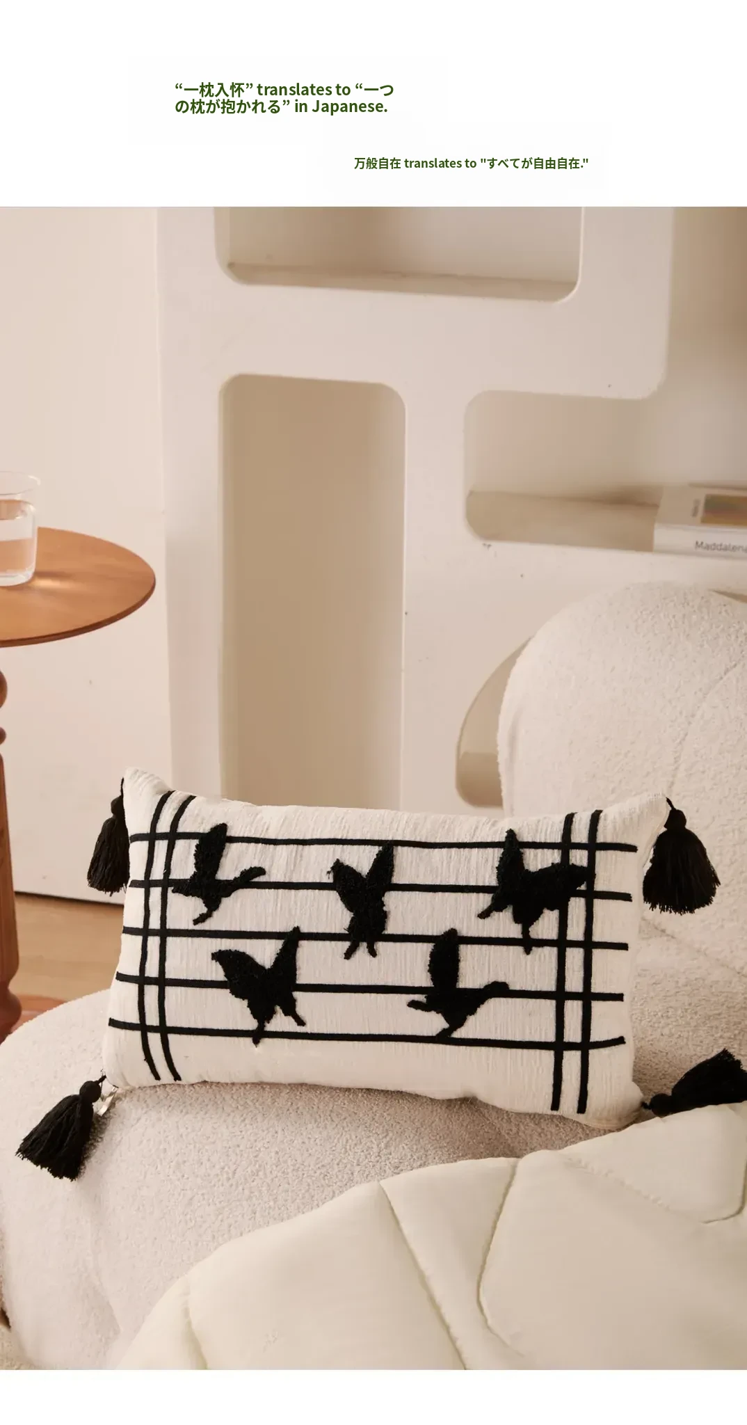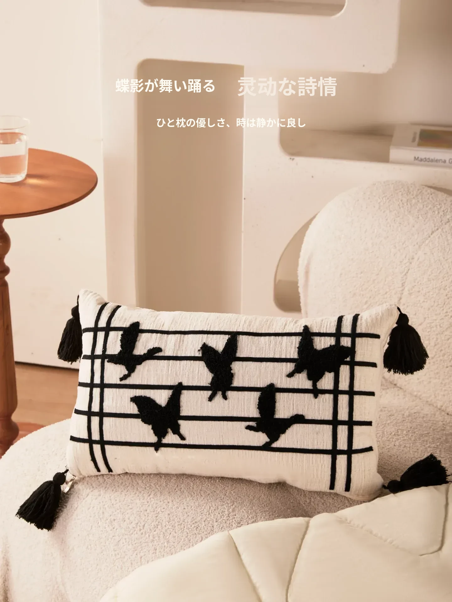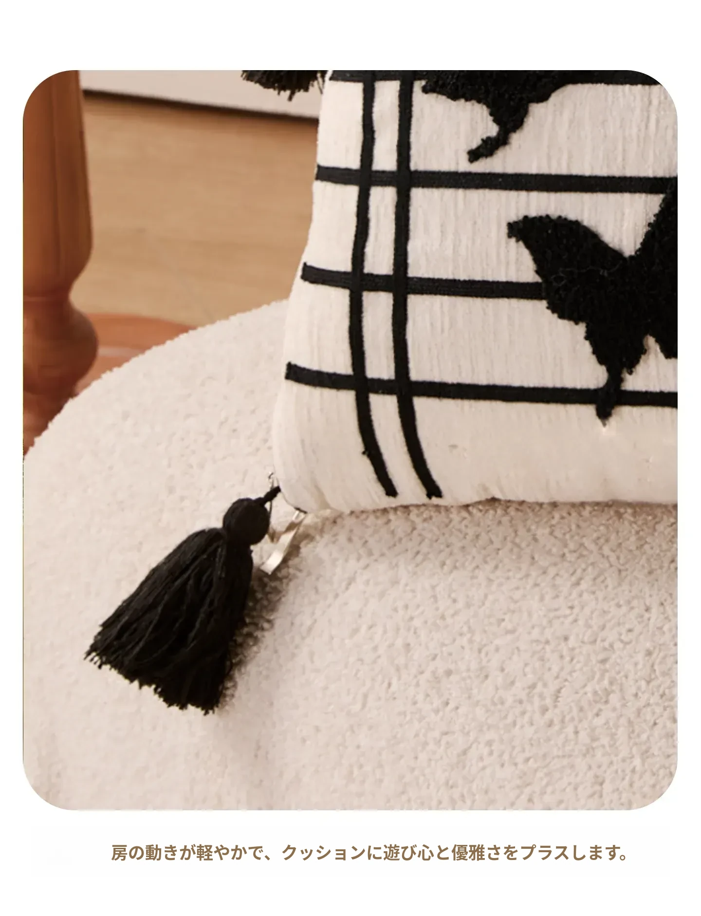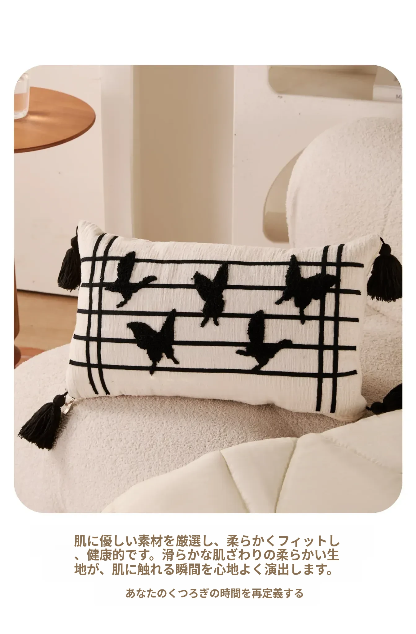 新中式デザインの流れるようなフリンジ付きバタフライクッション - 高級感溢れる黒色で、リビングやソファにぴったり!腰をサポートし、ベッドでの脚の間に置いても快適。優雅さと機能性を兼ね備えたアイテムです。