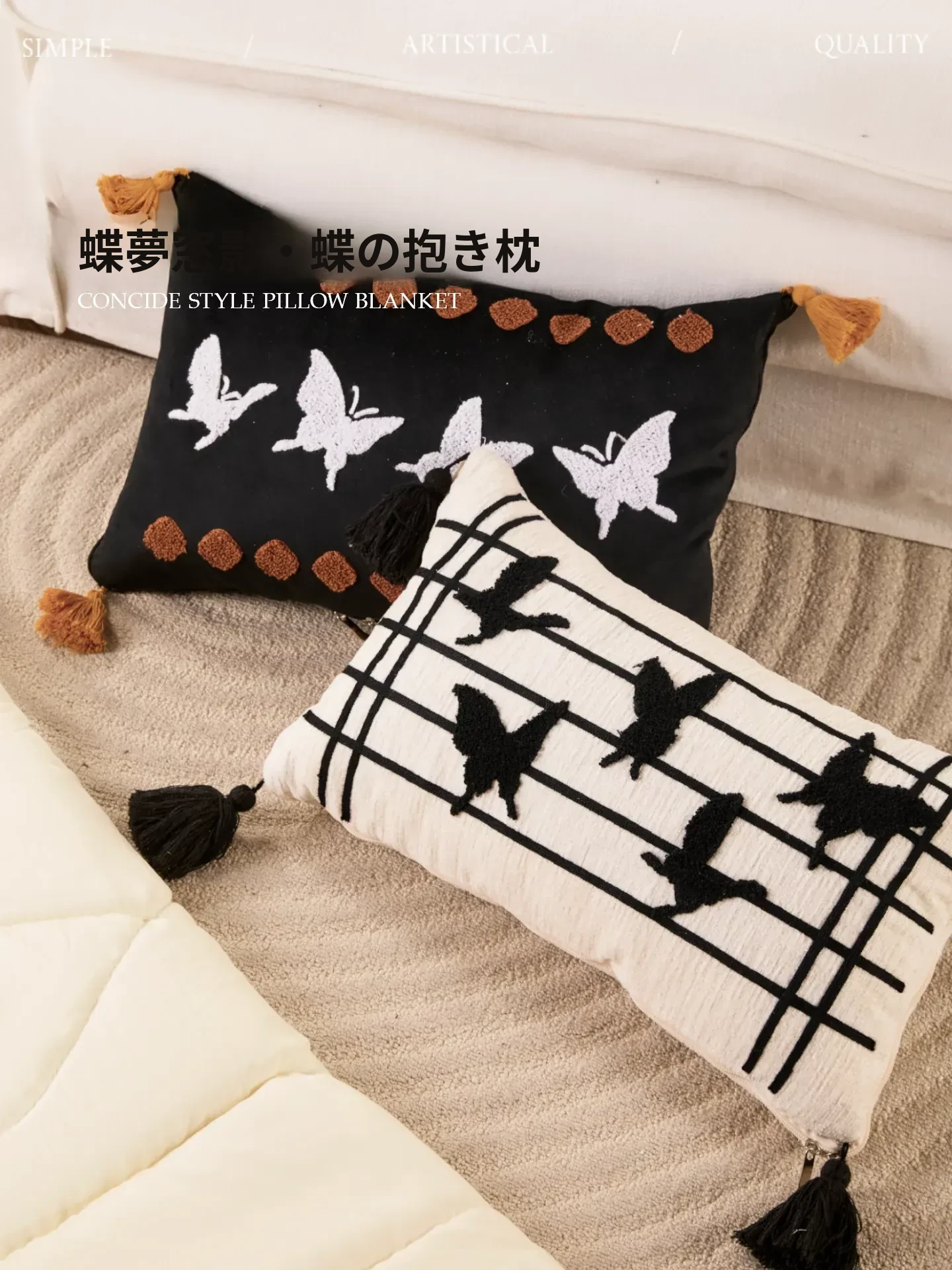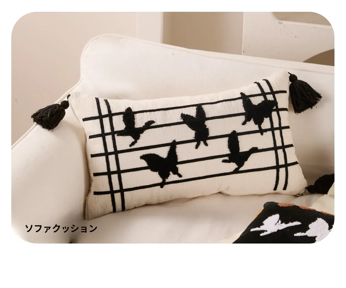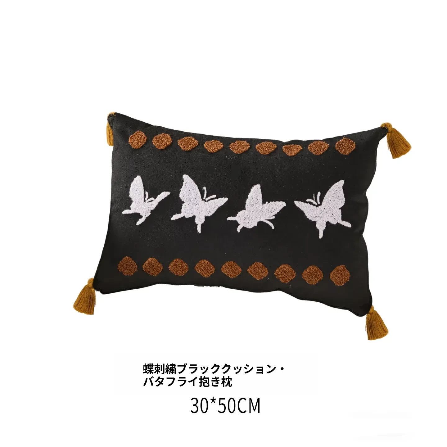 蝶刺繍黒四角バタフライクッション 30*50cmクッション中身+カバー