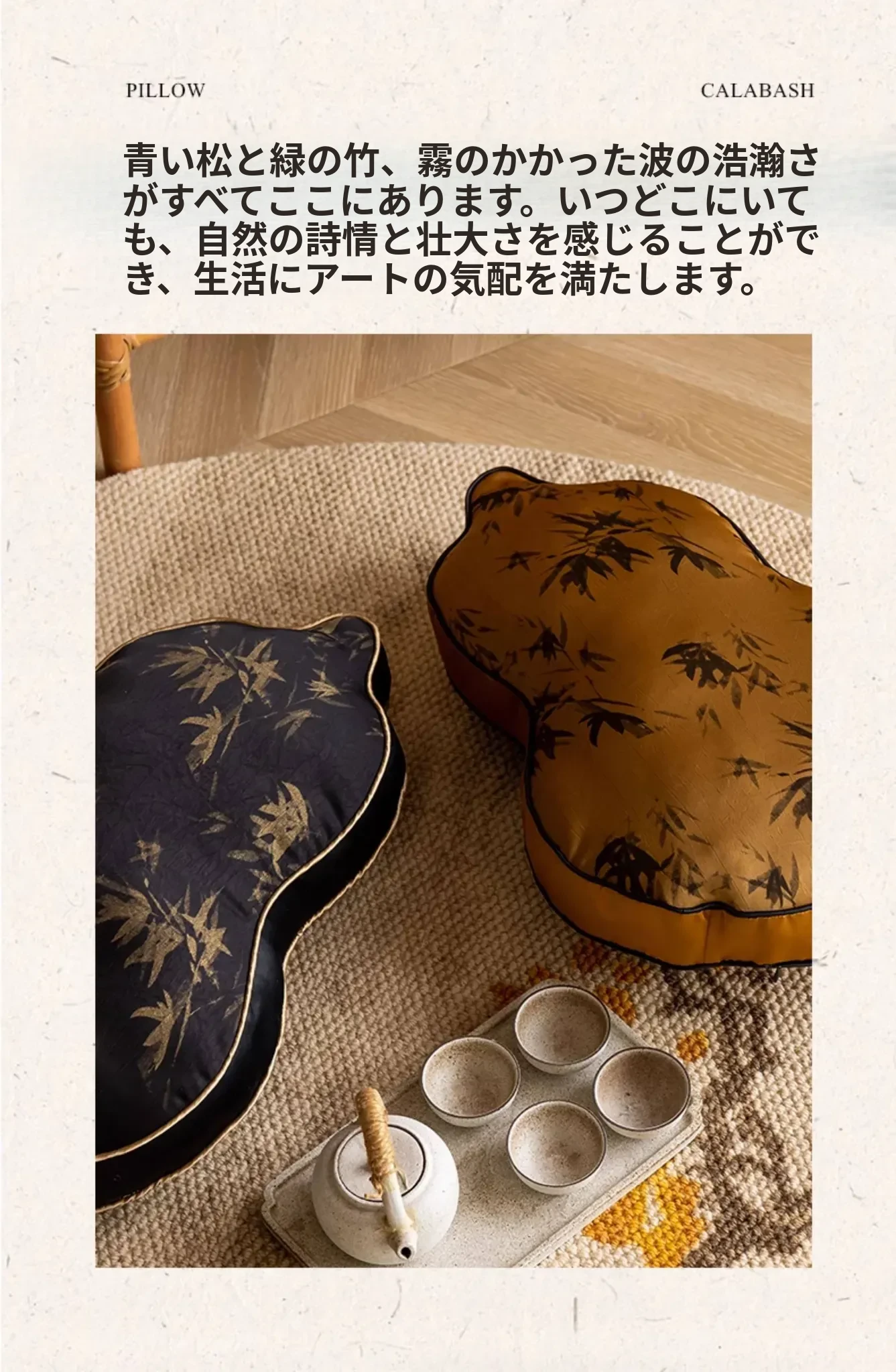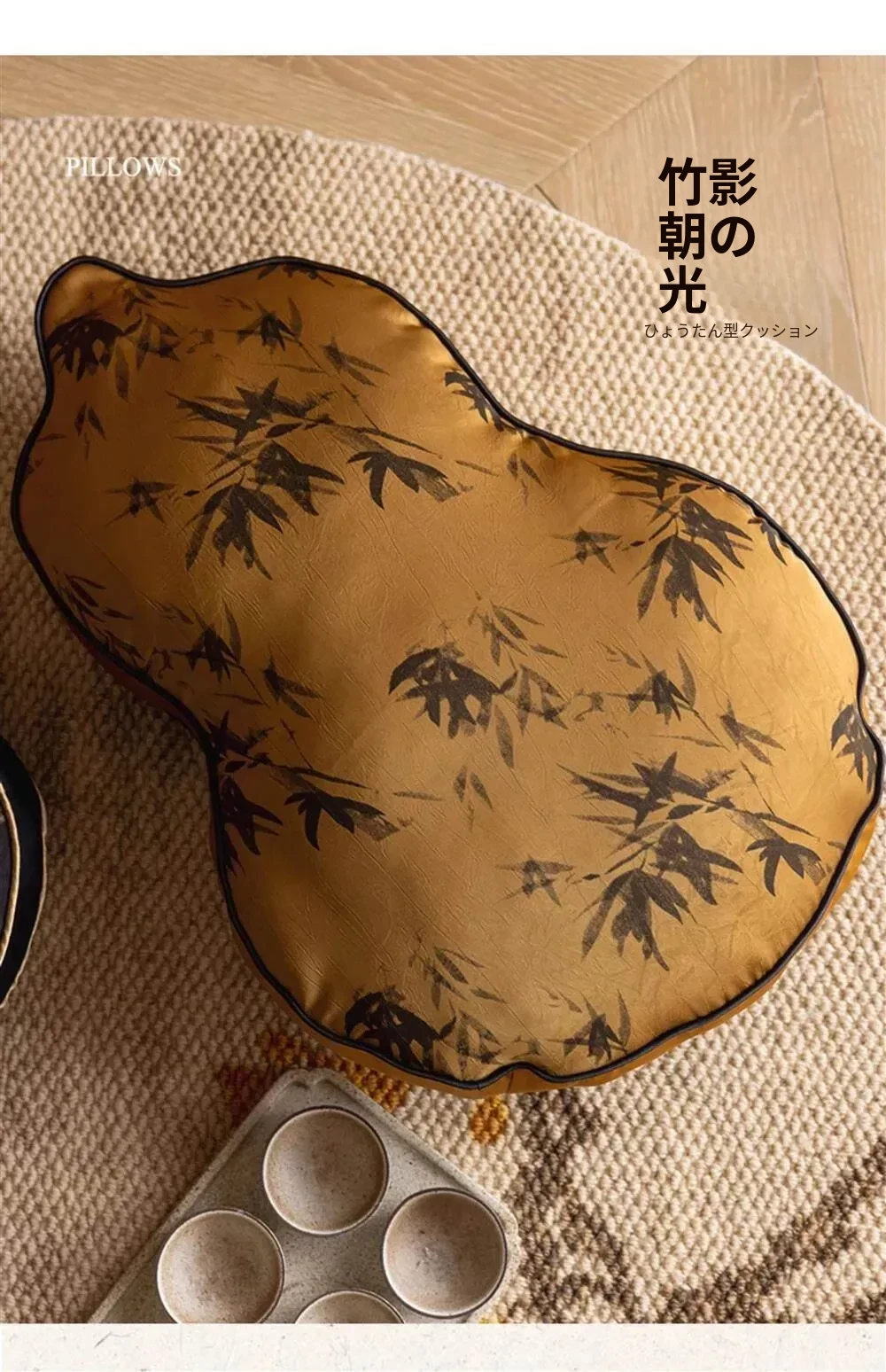 竹影の朝日 アンバー色のひょうたん型ボーダークッション