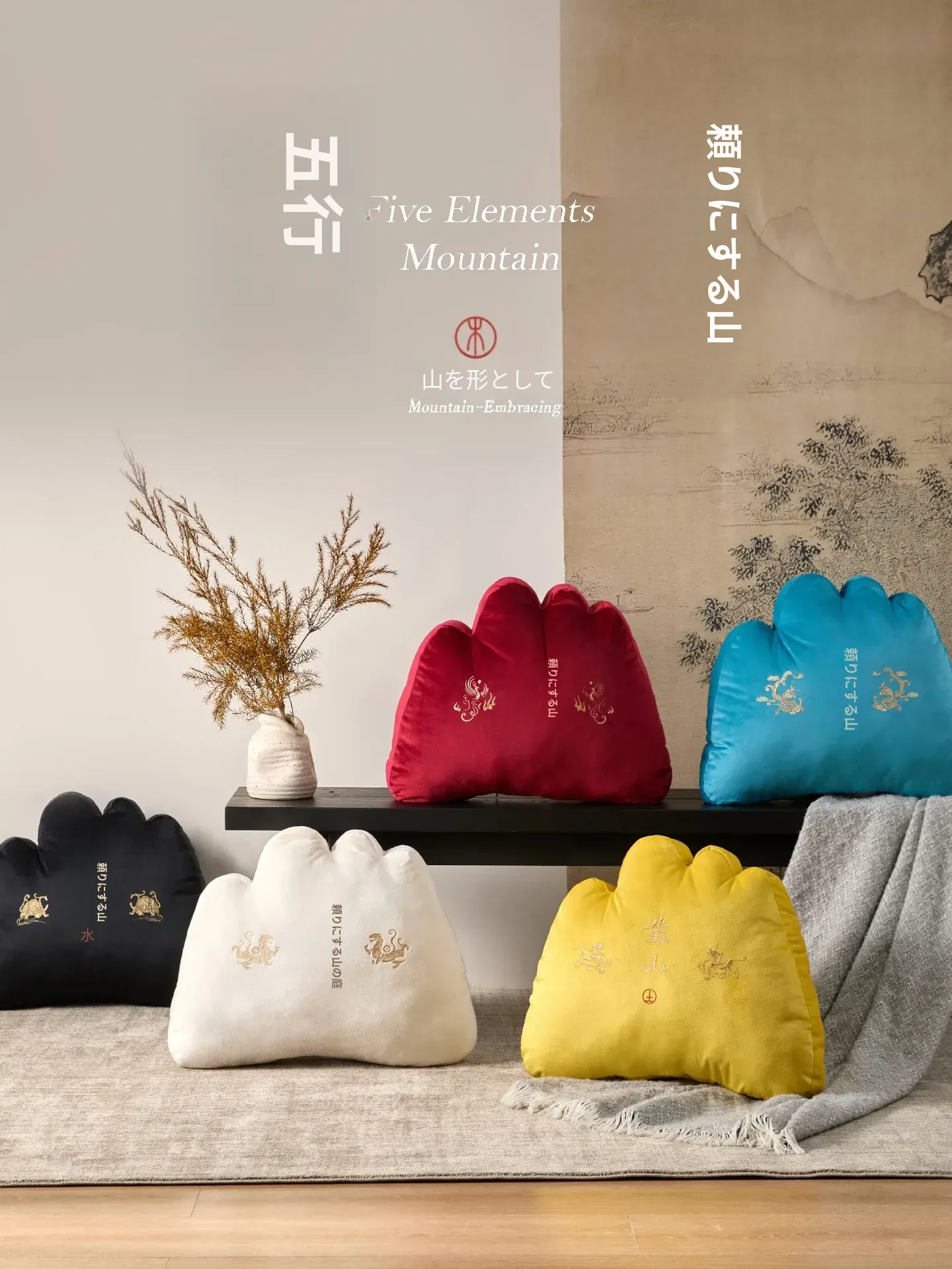 新中式五行デザインの山型クッション - オフィスやリビングに最適!背中をしっかりサポートし、心を落ち着ける禅の雰囲気を演出。アート感溢れる異形デザインで、座る場所をスタイリッシュに彩ります!