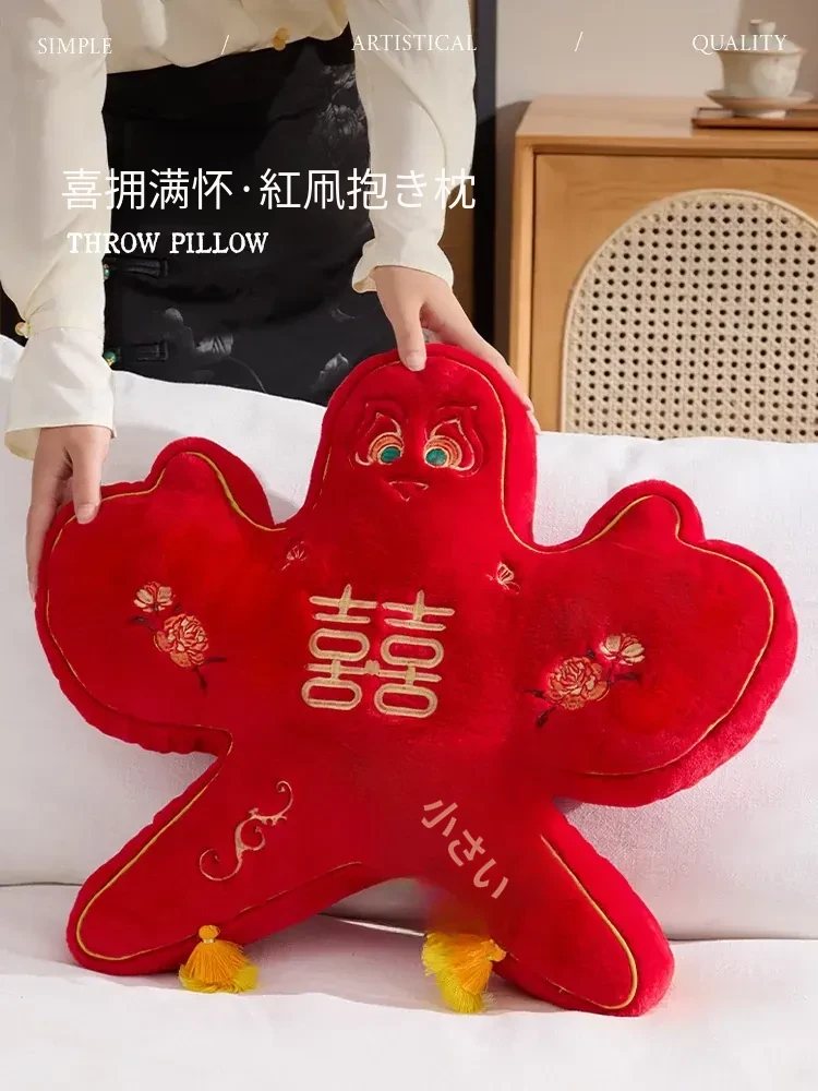 中古風の結婚式用凧型クッション - 客間ソファにぴったりな喜字デザイン!赤色で華やかさUP、家庭用にも最適!軽やかで高級感あふれるファー素材。あなたのリビングを特別な空間に変えます!