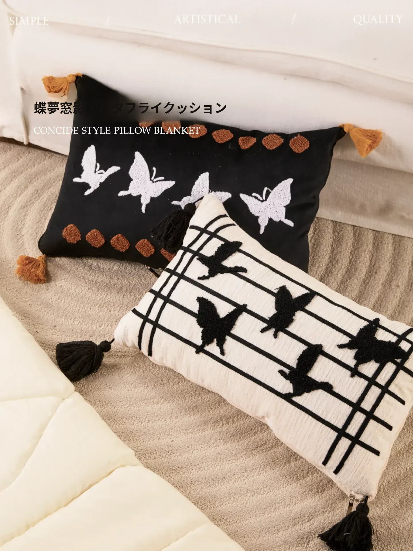 新中式デザインの流れるようなフリンジ付きバタフライクッション - 高級感溢れる黒色で、リビングやソファにぴったり!腰をサポートし、ベッドでの脚の間に置いても快適。優雅さと機能性を兼ね備えたアイテムです。