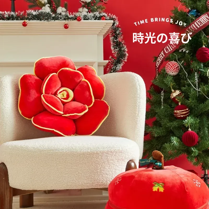 おしゃれな異形クッションカバー - 現代的でシンプルなデザイン、華やかな赤色の刺繍が施された不規則な形のクッション。リビングやソファにぴったりな山茶花のモチーフで、空間を華やかに彩ります!