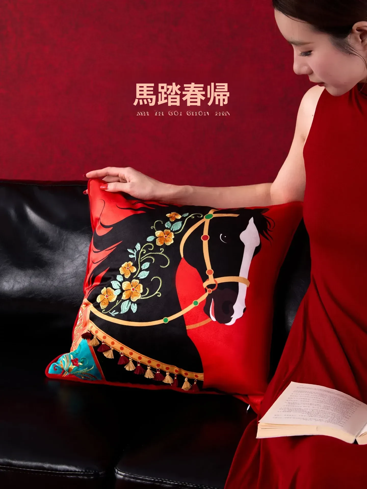 馬年中華刺繍入りクッション - リビングやベッドサイドにぴったり!トレンドのフリンジ付き、鮮やかな赤色でお部屋を華やかに演出。快適なサポートで、リラックスしたひとときを提供します!